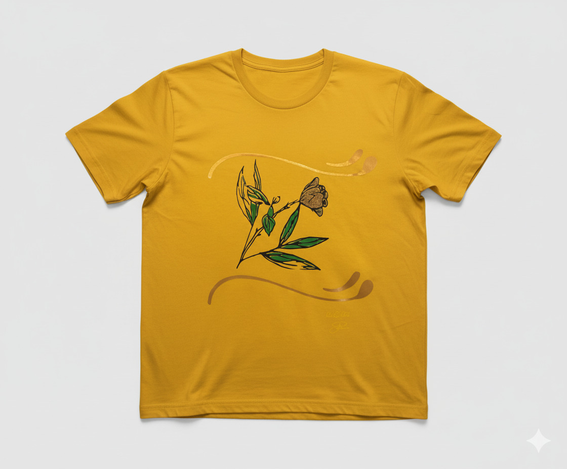 • A hand-drawn flower with glittery gold and green detailing