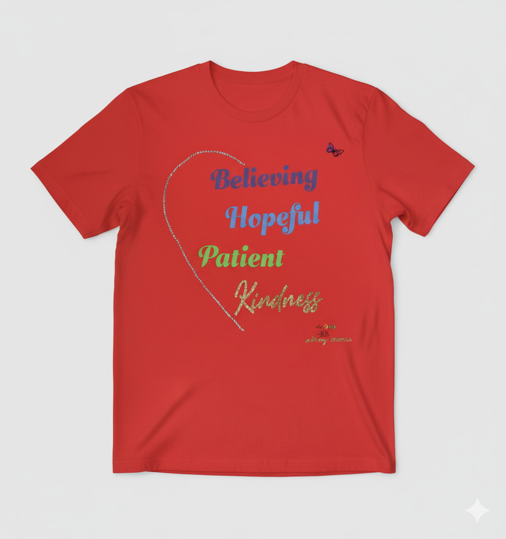 The radiant Kindness Tee (Design 1C) brings together sparkle, faith, and encouragement.